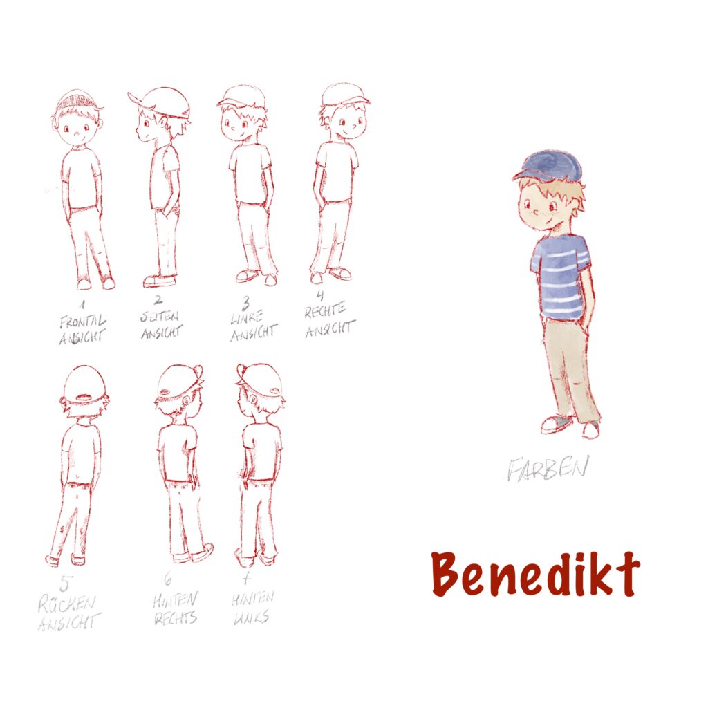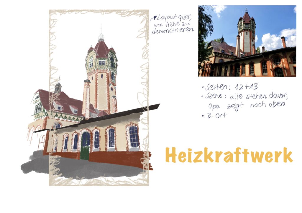 Bei einem Storyboard handelt es sich um eine Seite, die kleine, grobe Skizzen aller geplanten Doppelseiten, die das Buch bilden beinhaltet. Das hilft mir zum einen zu wissen welche Begebenheit wann, wo passiert, sowie einen Überblick des Projektes zu haben, auf das ich mich immer wieder zurückberufen kann. Bei diesem Schritt haben wir zum Beispiel gemerkt, das noch eine Doppelseite nötig war um die Geschichte zu unterstützen.