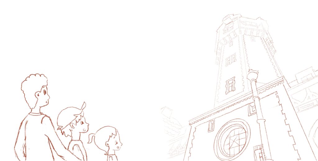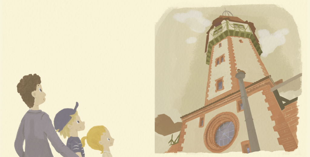 Als nächstes ging es an die Entwicklung des Settings. Das beinhaltet viel Recherche und Nachforschen, was mir wirklich Spaß gemacht hat. Nun hatten wir ein Gefühl davon in welche Richtung die Illustrationen der Gebäude gingen, die der Opa den Kindern in der Geschichte vorstellt. Dabei habe ich außerdem die Farbpalette für das Projekt festgelegt, sowie die Ausarbeitung der Details und Texturen, das heißt auch wie detailreich sie nachher werden sollten.